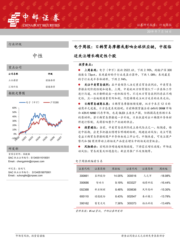 【中邮证券】【20190714】20190714-中邮证券-电子周报:日韩贸易摩擦或影响全球供应链,中报临近关注增长确定性个股-10页