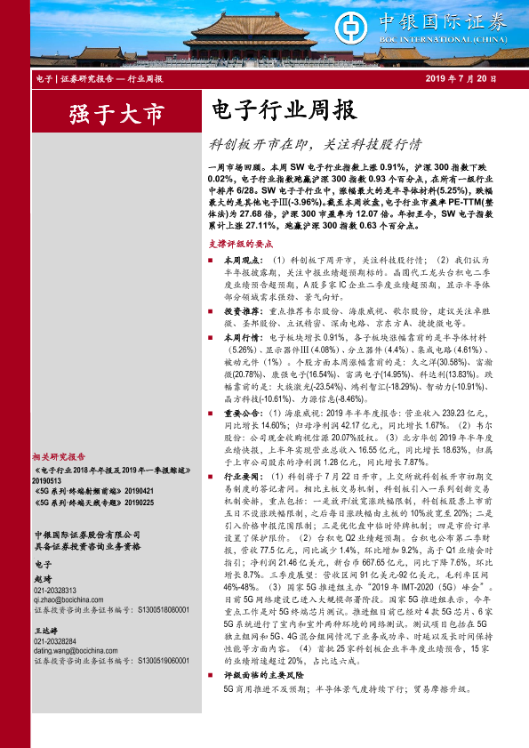 【中银证券】【20190720】电子行业周报:科创板开市在即,关注科技股行情-17页
