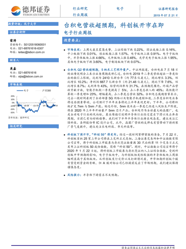 【德邦证券】【20190721】20190721-德邦证券-电子行业周报:台积电营收超预期,科创板开市在即-4页