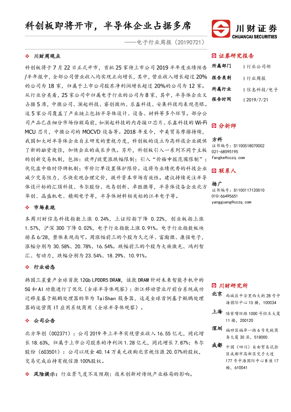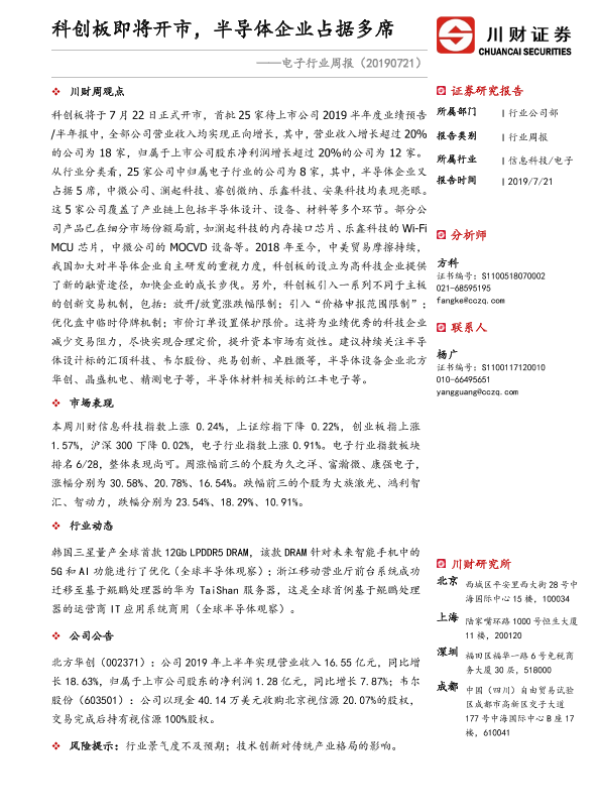 【川财证券】【20190721】电子行业周报:科创板即将开市,半导体企业占据多席-11页