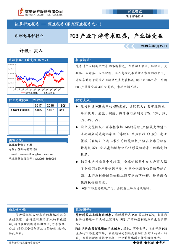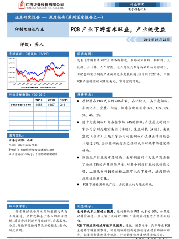 【红塔证券】【20190722】20190722-红塔证券-电子信息深度报告(系列深度报告之一):PCB产业下游需求旺盛,产业链受益-27页