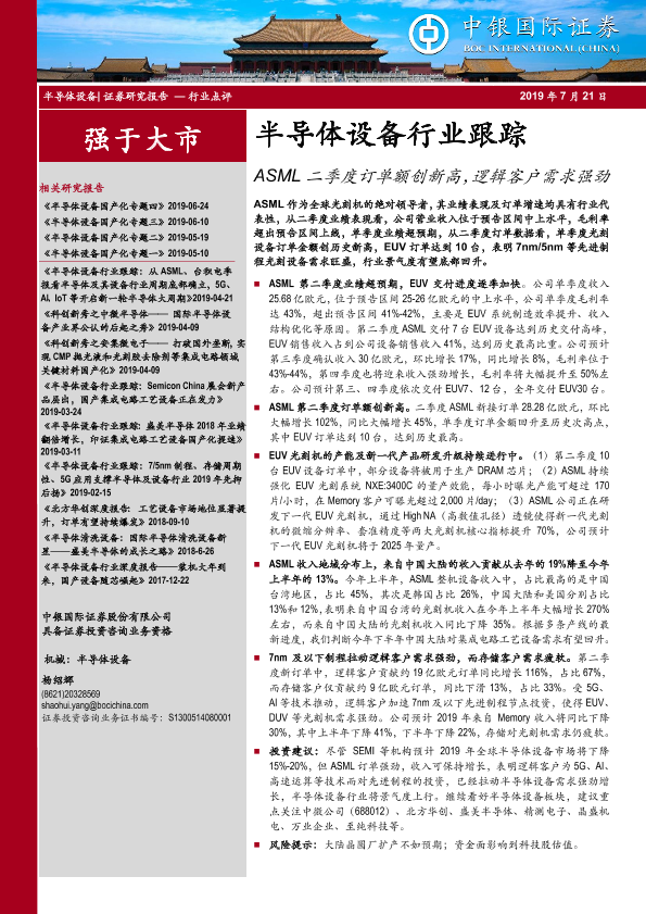 【中银证券】【20190721】半导体设备行业跟踪:ASML二季度订单额创新高,逻辑客户需求强劲-6页