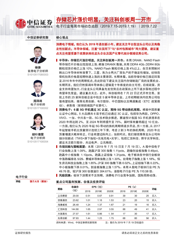 【中信证券】【20190722】电子行业每周市场动态追踪:存储芯片涨价明显,关注科创板周一开市-17页