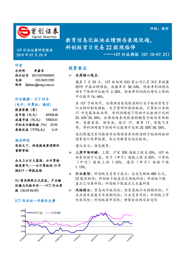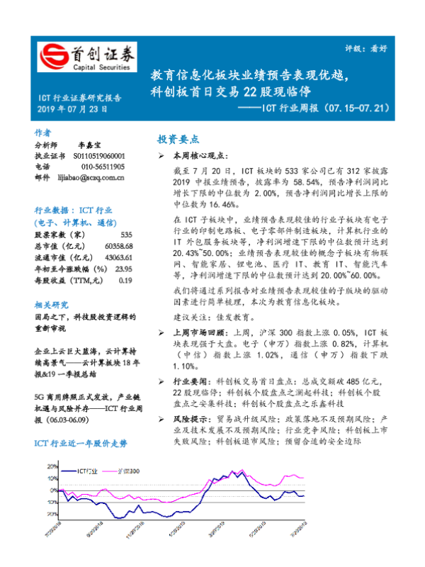 【首创证券】【20190723】20190723-首创证券-ICT行业周报:教育信息化板块业绩预告表现优越,科创板首日交易22股现临停-15页