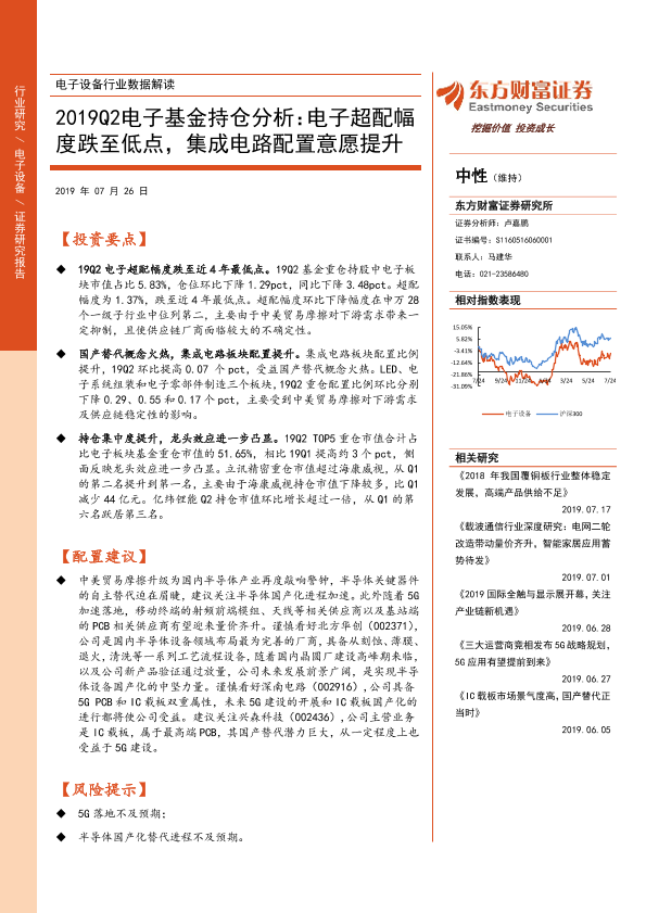 【东方财富证券】【20190726】2019Q2电子基金持仓分析:电子超配幅度跌至低点,集成电路配置意愿提升-10页