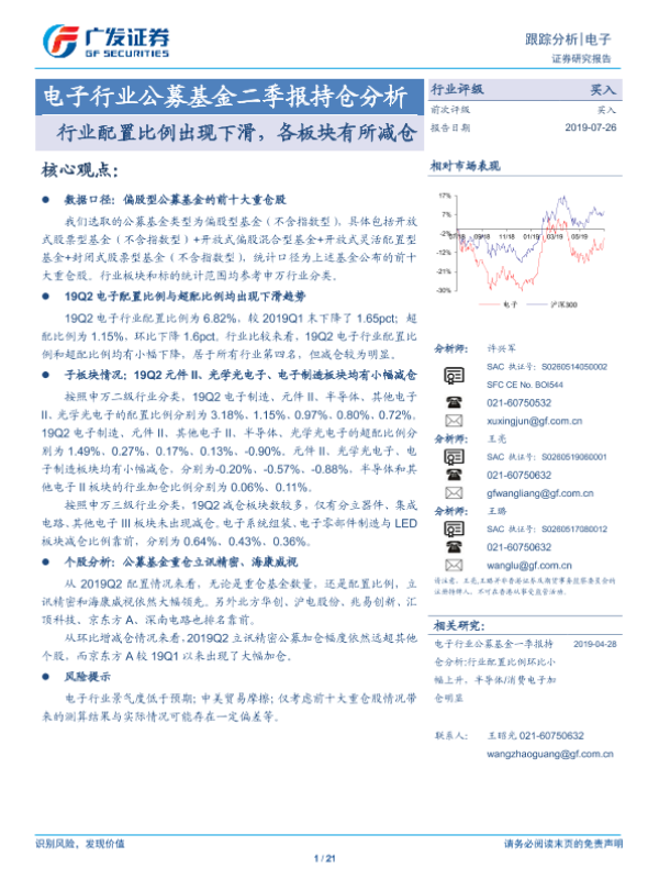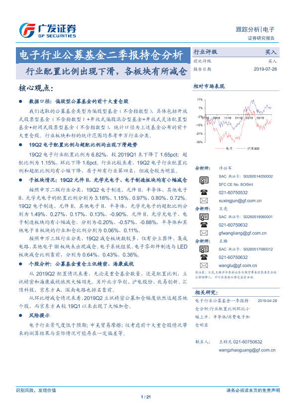【广发证券】【20190726】电子行业公募基金二季报持仓分析:行业配置比例出现下滑,各板块有所减仓-21页