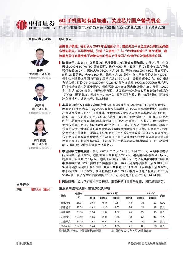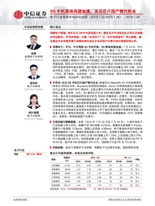 【中信证券】【20190729】电子行业每周市场动态追踪:5G手机落地有望加速,关注芯片国产替代机会-13页