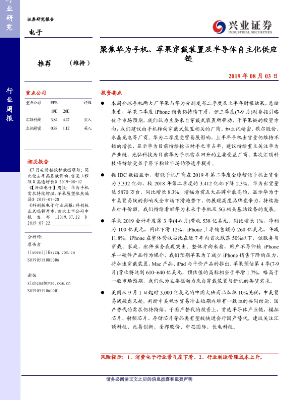 【兴业证券】【20190803】20190803-兴业证券-电子行业周报:聚焦华为手机、苹果穿戴装置及半导体自主化供应链-13页