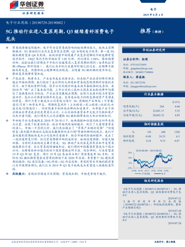 【华创证券】【20190804】20190804-华创证券-电子行业周报:5G推动行业进入复苏周期,Q3继续看好消费电子龙头-18页