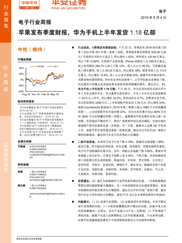 【平安证券】【20190804】电子行业周报:苹果发布季度财报,华为手机上半年发货1.18亿部-5页