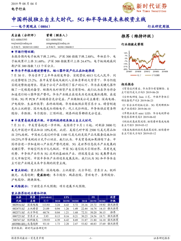 【新时代证券】【20190804】20190804-新时代证券-电子周观点:中国科技独立自主大时代,5G和半导体是未来投资主线-16页