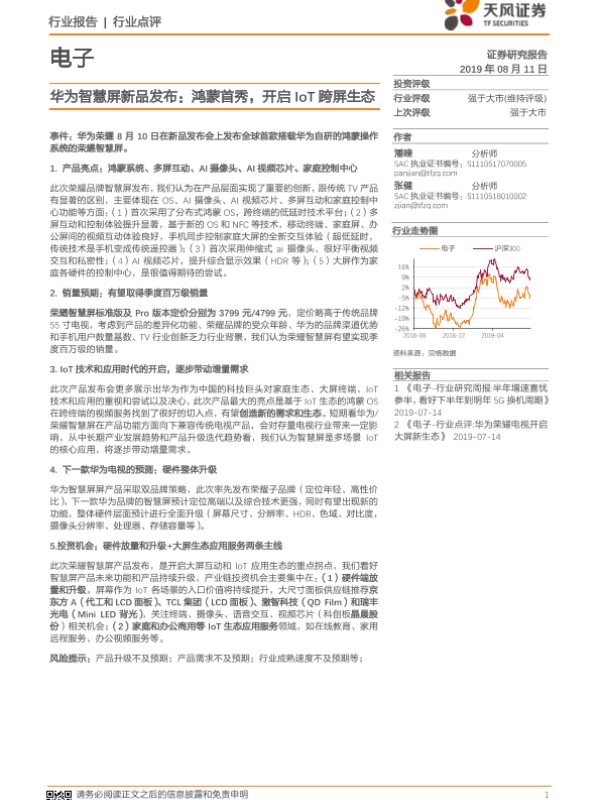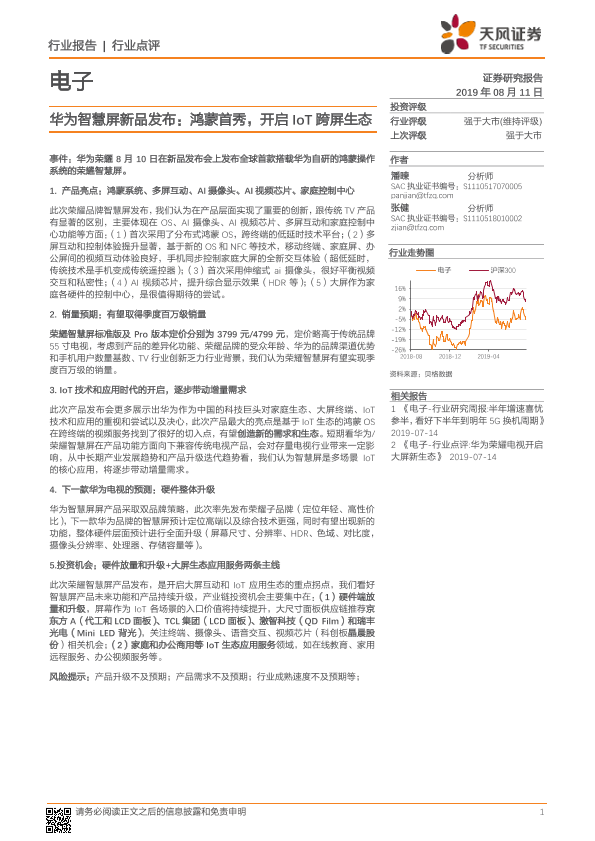 【天风证券】【20190811】20190811-天风证券-电子行业点评:华为智慧屏新品发布:鸿蒙首秀,开启IoT跨屏生态-15页