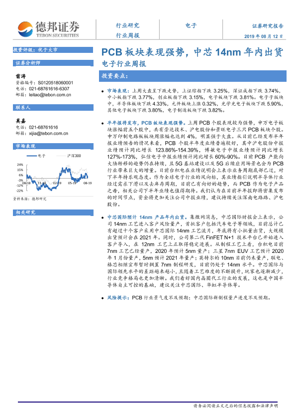 【德邦证券】【20190812】20190812-德邦证券-电子行业周报:PCB板块表现强势,中芯14nm年内出货-4页