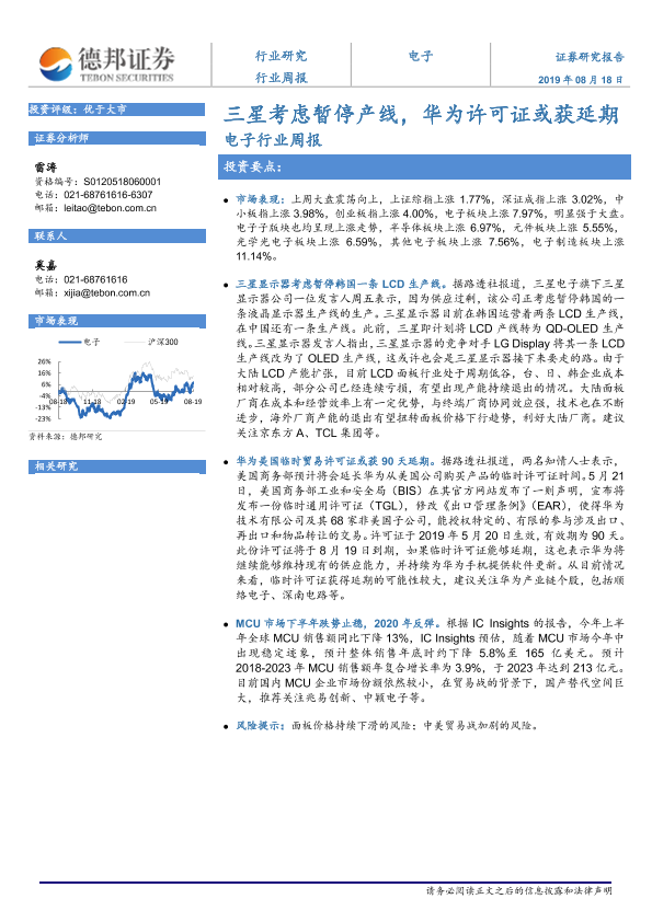 【德邦证券】【20190818】20190818-德邦证券-电子行业周报:三星考虑暂停产线,华为许可证或获延期-4页