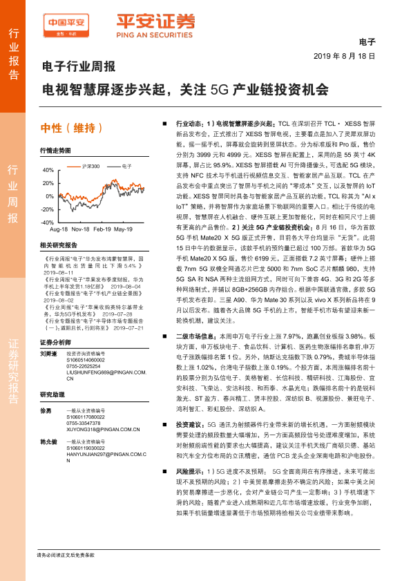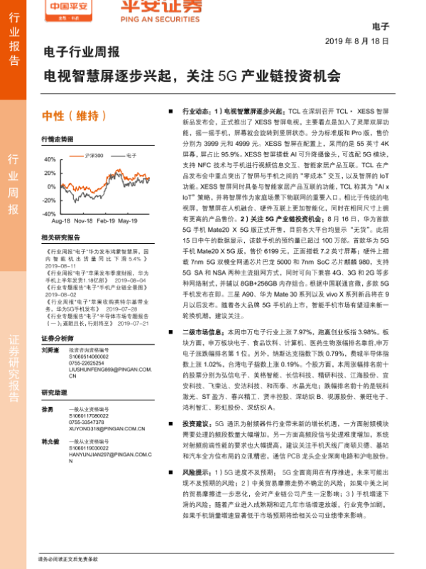 【平安证券】【20190818】电子行业周报:电视智慧屏逐步兴起,关注5G产业链投资机会-5页