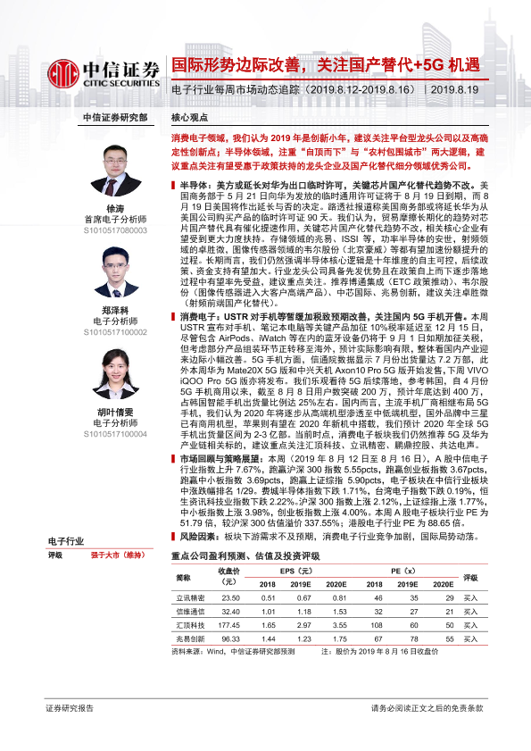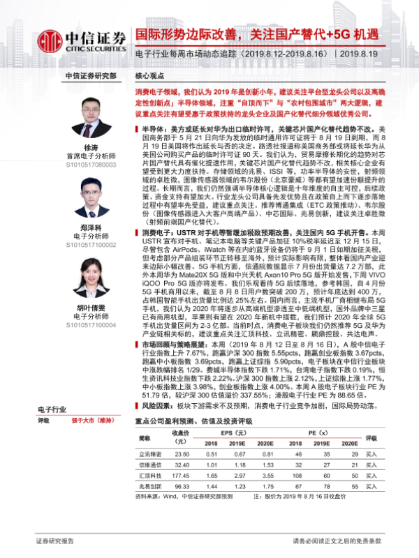 【中信证券】【20190819】电子行业每周市场动态追踪:国际形势边际改善,关注国产替代+5G机遇-15页