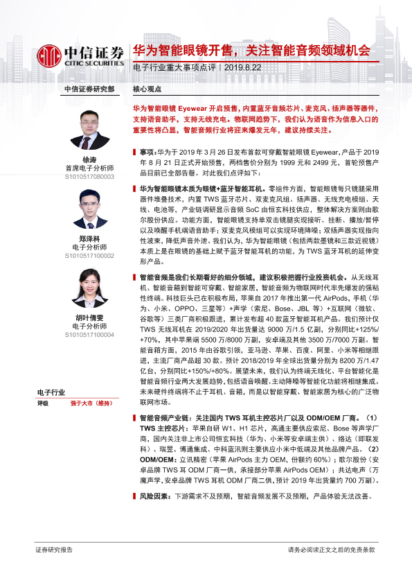 【中信证券】【20190822】电子行业重大事项点评:华为智能眼镜开售,关注智能音频领域机会-3页