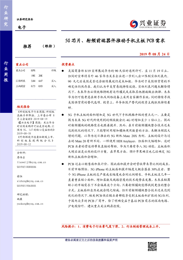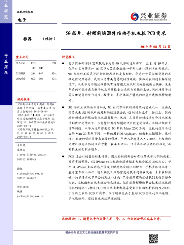 【兴业证券】【20190824】20190824-兴业证券-电子行业周报:5G芯片、射频前端器件推动手机主板PCB需求-10页