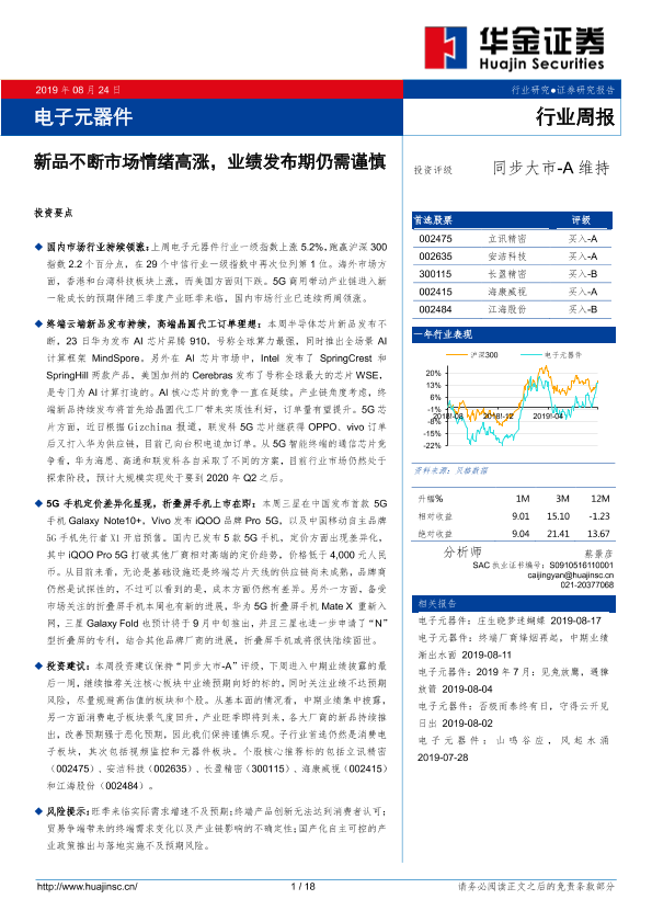 【华金证券】【20190824】电子元器件行业周报:新品不断市场情绪高涨,业绩发布期仍需谨慎-18页