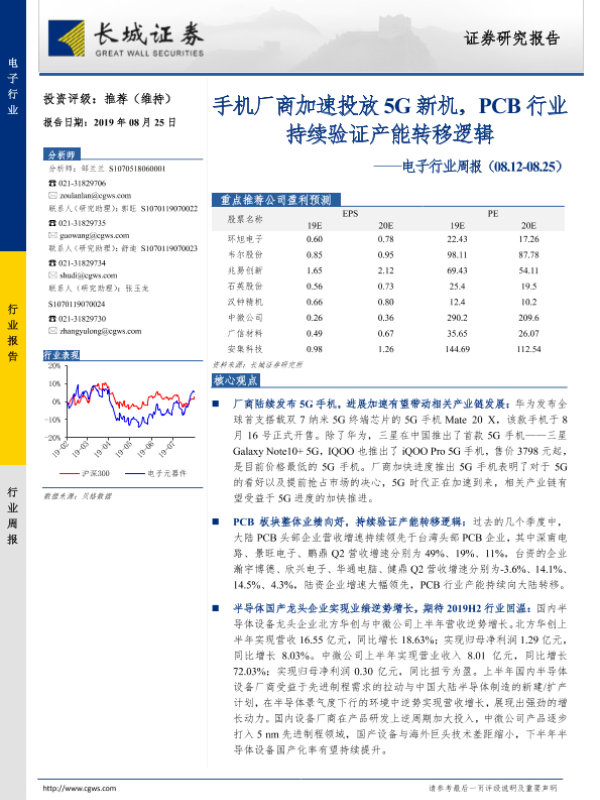 【长城证券】【20190825】电子行业周报:手机厂商加速投放5G新机,PCB行业持续验证产能转移逻辑-30页
