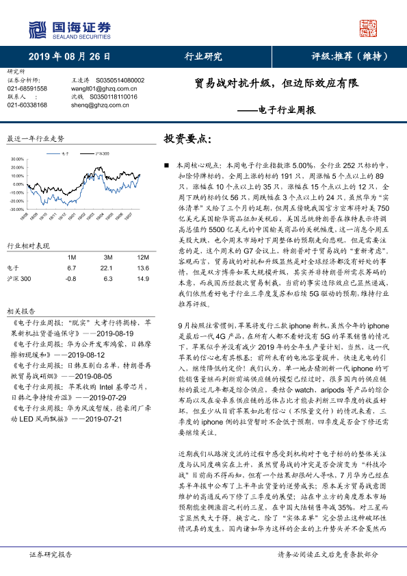 【国海证券】【20190826】电子行业周报:贸易战对抗升级,但边际效应有限-13页