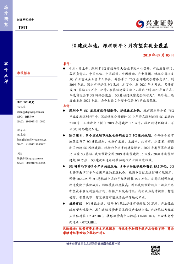 【兴业证券】【20190905】5G建设加速,深圳明年8月有望实现全覆盖-4页