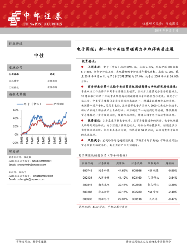 【中邮证券】【20190907】20190907-中邮证券-电子周报:新一轮中美经贸磋商力争取得实质进展-9页