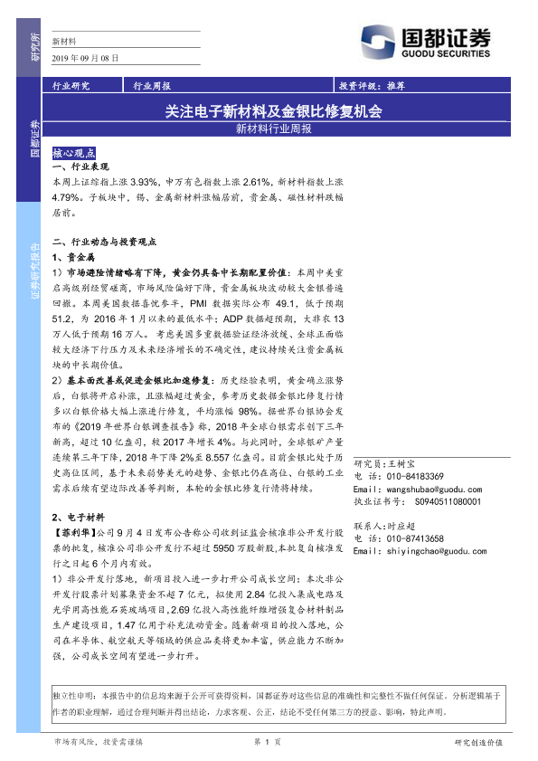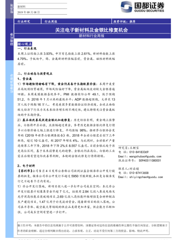 【国都证券】【20190908】新材料行业周报:关注电子新材料及金银比修复机会-3页