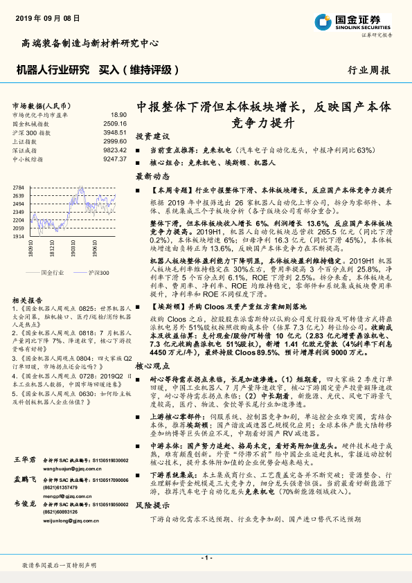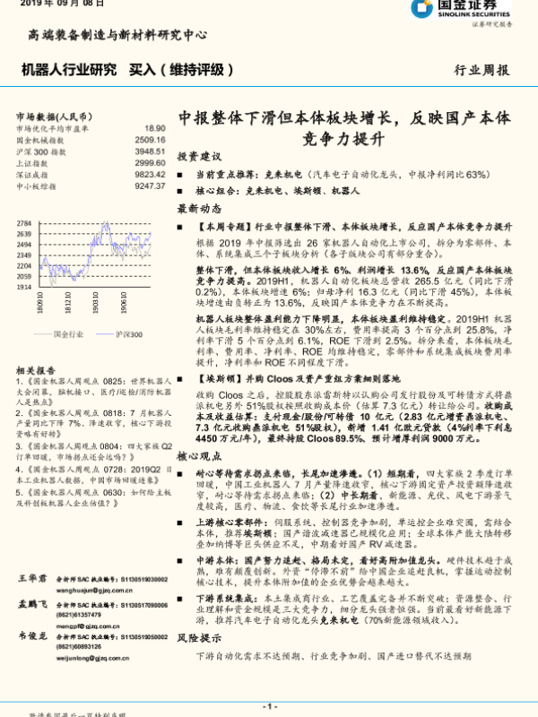 【国金证券】【20190908】20190908-国金证券-机器人行业研究:中报整体下滑但本体板块增长,反映国产本体竞争力提升-18页
