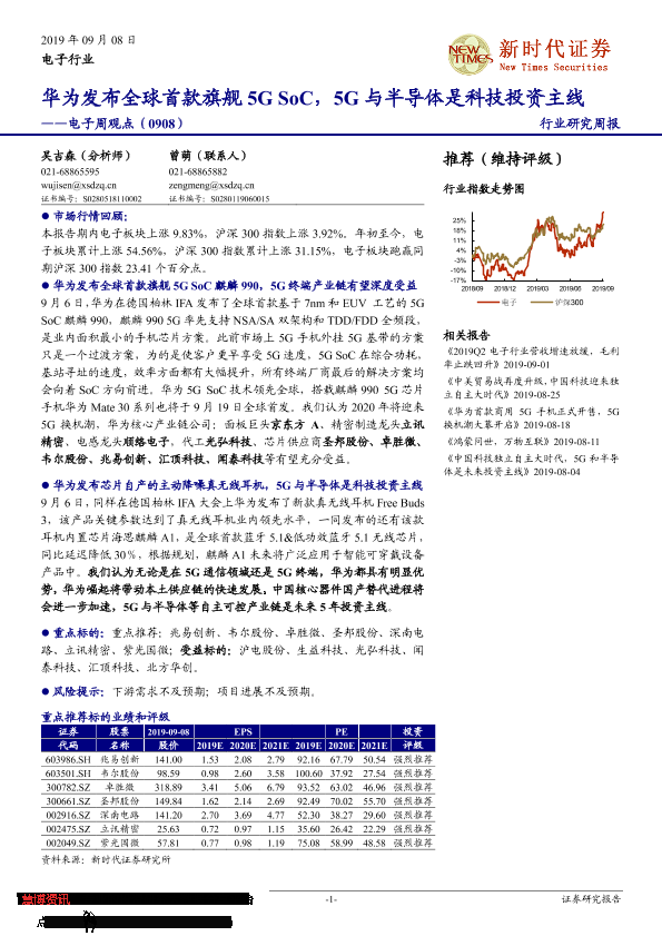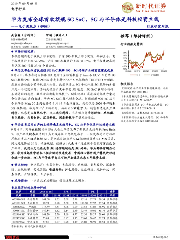 【新时代证券】【20190908】电子周观点:华为发布全球首款旗舰5G SoC,5G与半导体是科技投资主线-14页