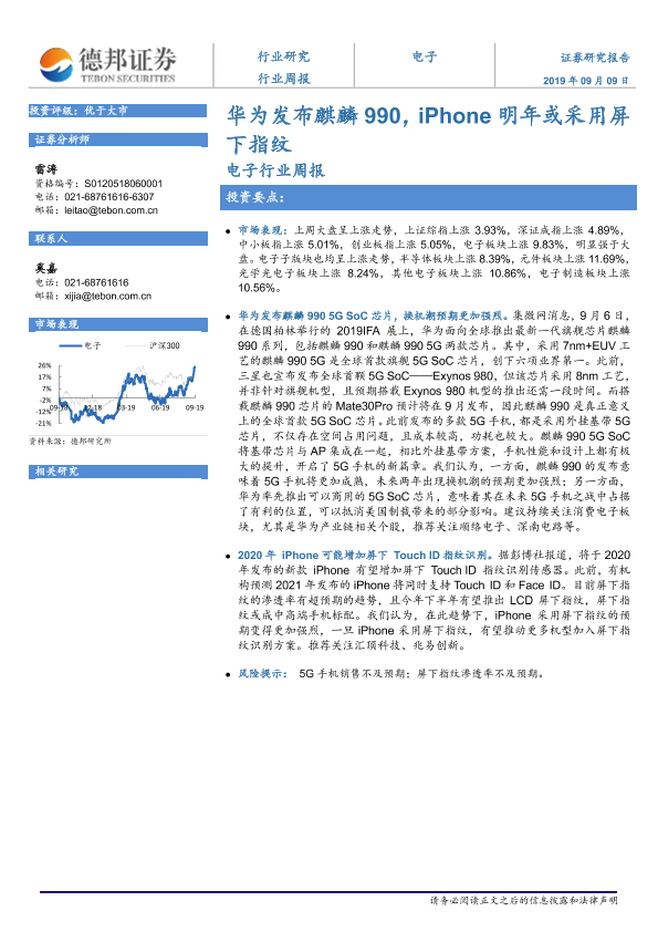【德邦证券】【20190909】电子行业周报:华为发布麒麟990,iPhone明年或采用屏下指纹-4页