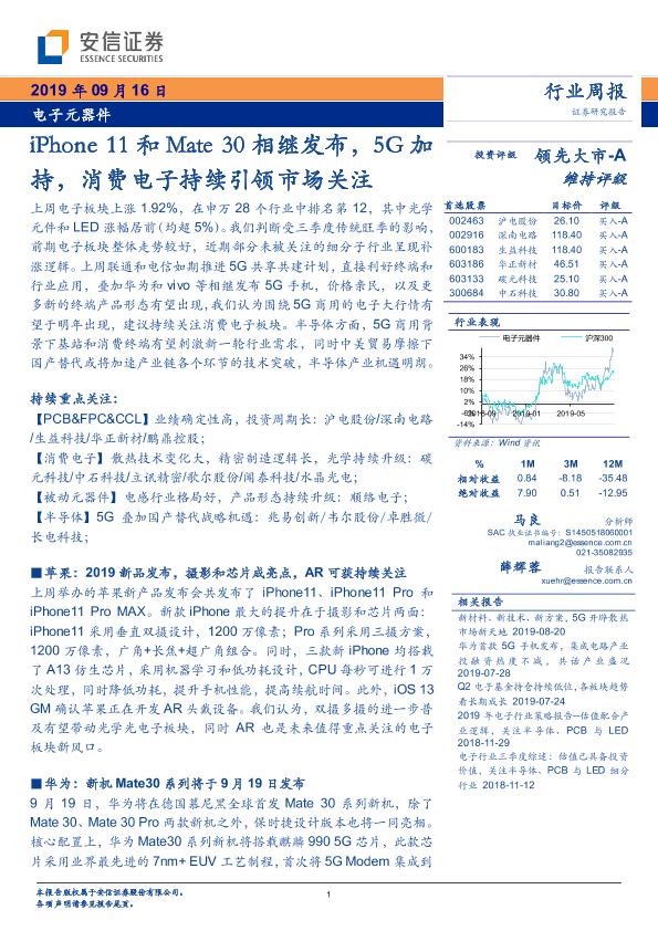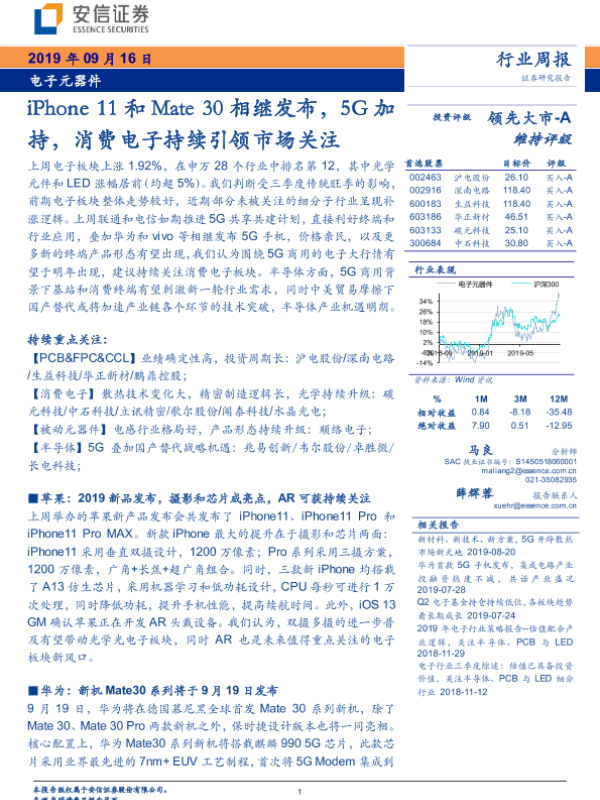 【安信证券】【20190916】电子元器件行业周报:iPhone11和Mate30相继发布,5G加持,消费电子持续引领市场关注-11页