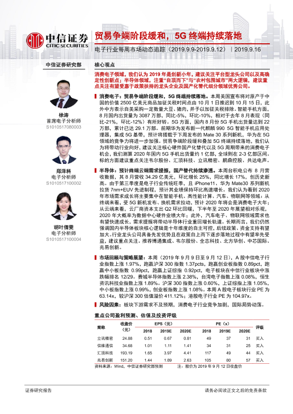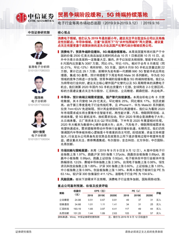 【中信证券】【20190916】电子行业每周市场动态追踪:贸易争端阶段缓和,5G终端持续落地-15页