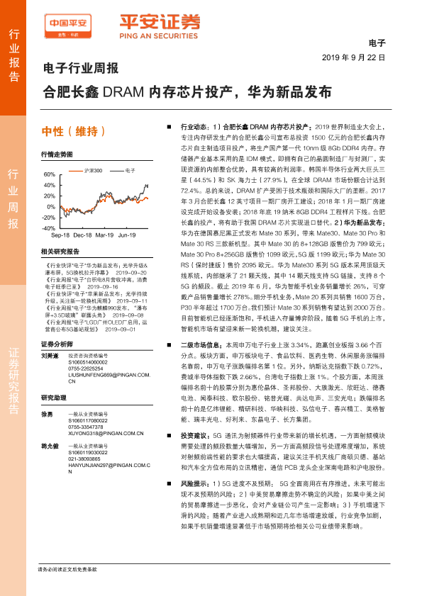 【平安证券】【20190922】电子行业周报:合肥长鑫DRAM内存芯片投产,华为新品发布-5页