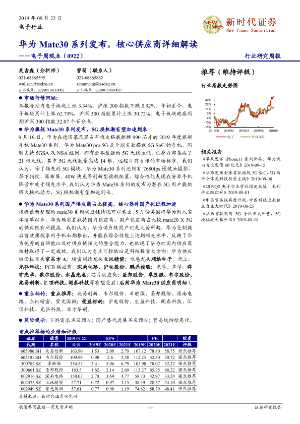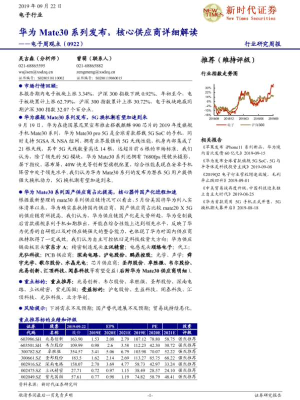 【新时代证券】【20190922】电子周观点:华为Mate30系列发布,核心供应商详细解读-19页