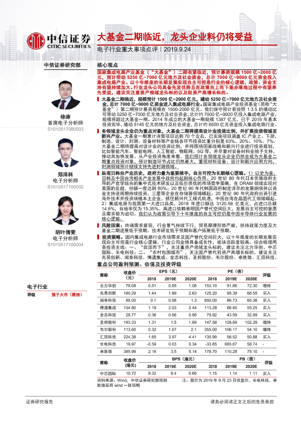 【中信证券】【20190924】电子行业重大事项点评:大基金二期临近,龙头企业料仍将受益-18页