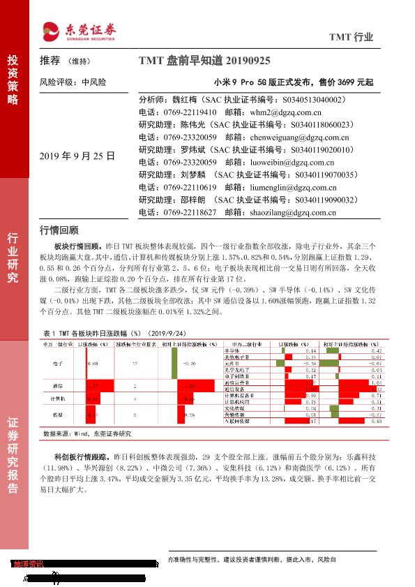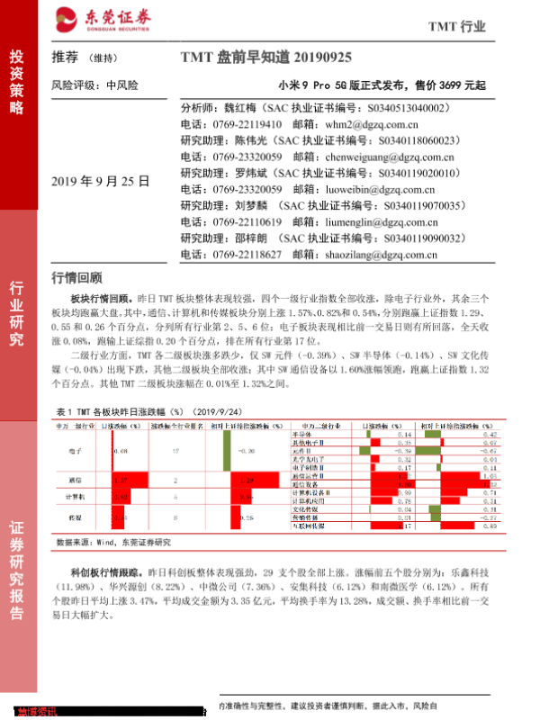 【东莞证券】【20190925】TMT行业盘前早知道:小米9Pro5G版正式发布,售价3699元起-5页