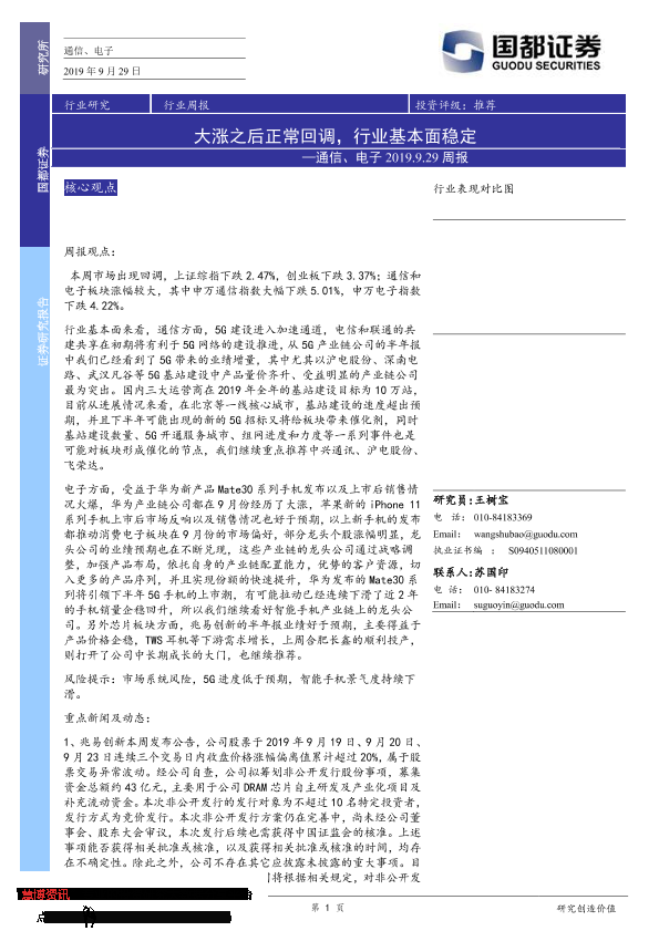 【国都证券】【20190929】通信、电子行业周报:大涨之后正常回调,行业基本面稳定-3页