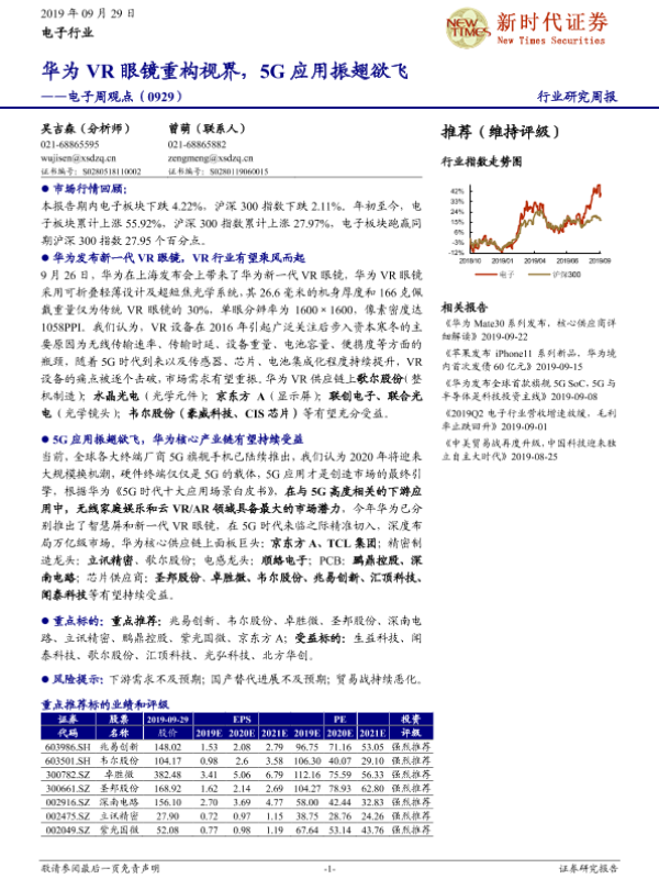 【新时代证券】【20190929】20190929-新时代证券-电子周观点:华为VR眼镜重构视界,5G应用振翅欲飞-18页