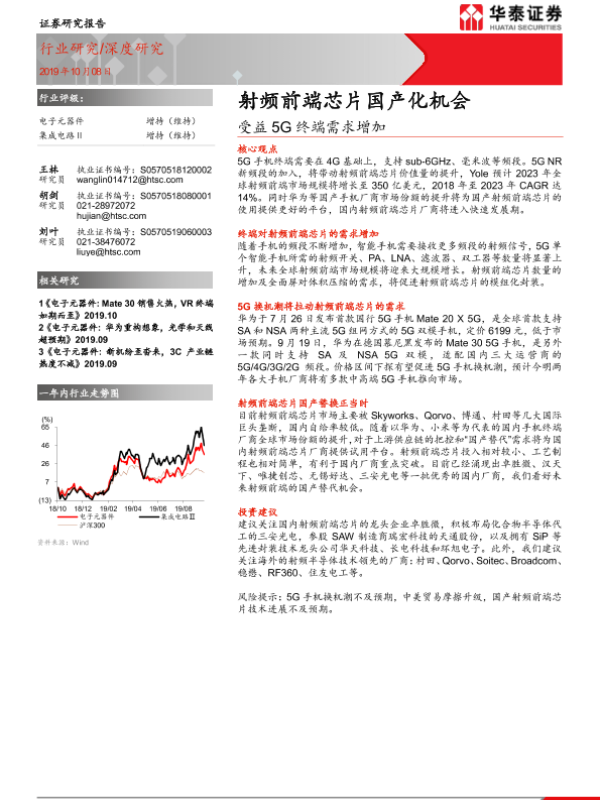 【华泰证券】【20191008】电子元器件深度研究:射频前端芯片国产化机会-受益5G终端需求增加-49页