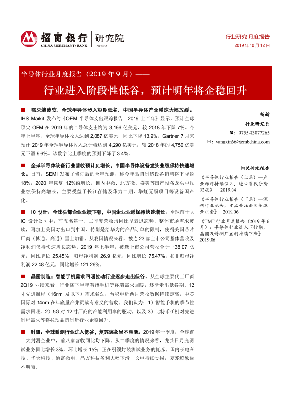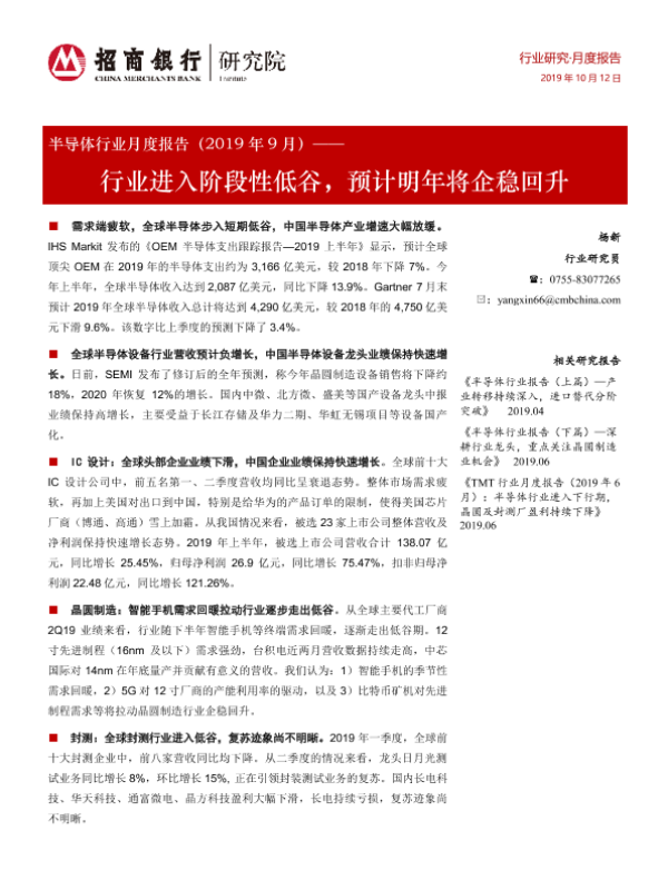 【招商银行】【20191012】半导体行业月度报告(2019年9月)——行业进入阶段性低谷,预计明年将企稳回升-18页
