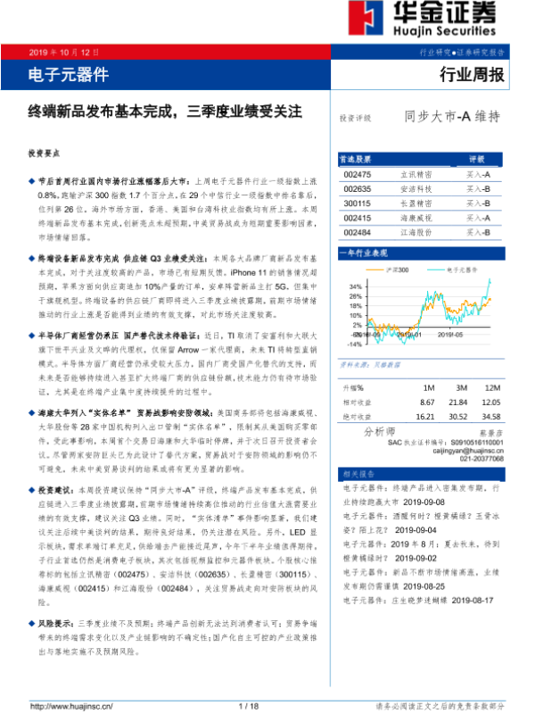 【华金证券】【20191012】20191012-华金证券-电子元器件行业周报:终端新品发布基本完成,三季度业绩受关注-18页