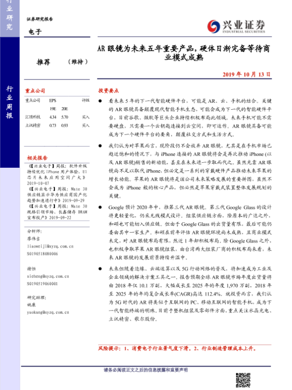 【兴业证券】【20191013】AR眼镜为未来五年重要产品,硬体日渐完备等待商业模式成熟-10页