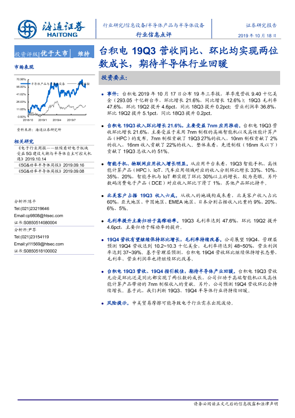 【海通证券】【20191018】20191018-海通证券-半导体产品与半导体设备行业信息点评:台积电19Q3营收同比、环比均实现两位数成长,期待半导体行业回暖-2页