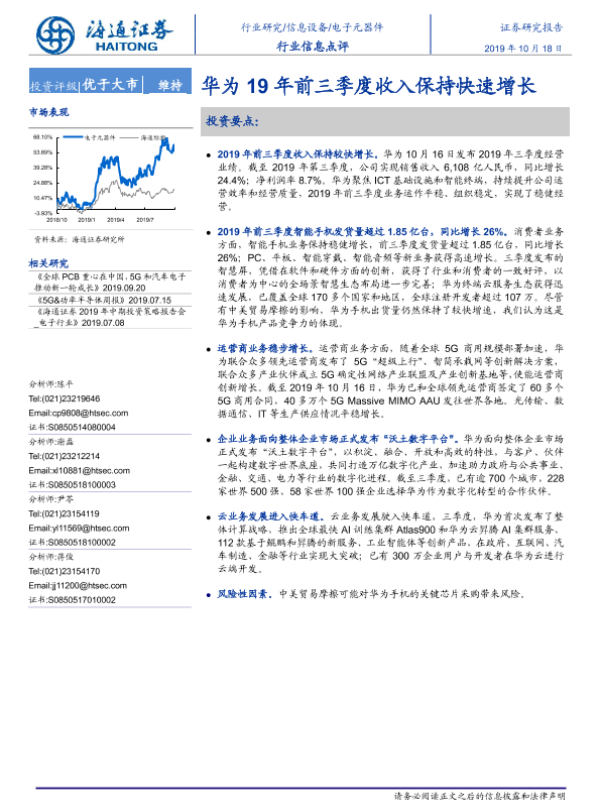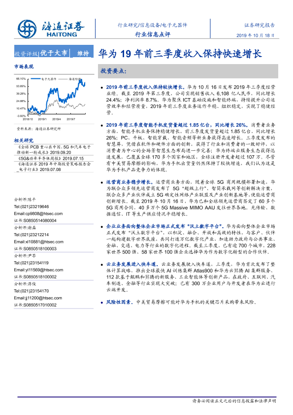 【海通证券】【20191018】电子元器件行业信息点评:华为19年前三季度收入保持快速增长-2页