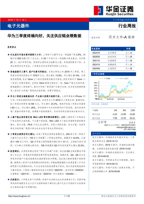 【华金证券】【20191019】20191019-华金证券-电子元器件行业周报:华为三季度终端向好,关注供应链业绩数据-18页