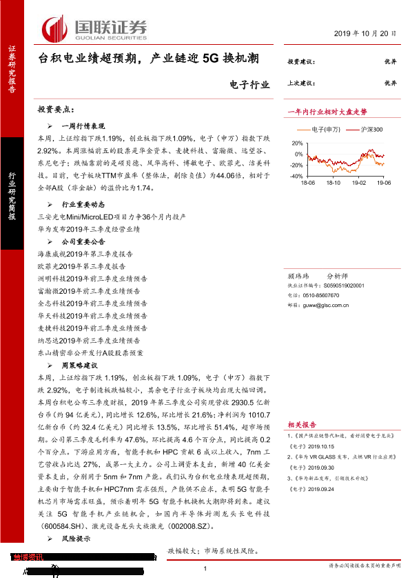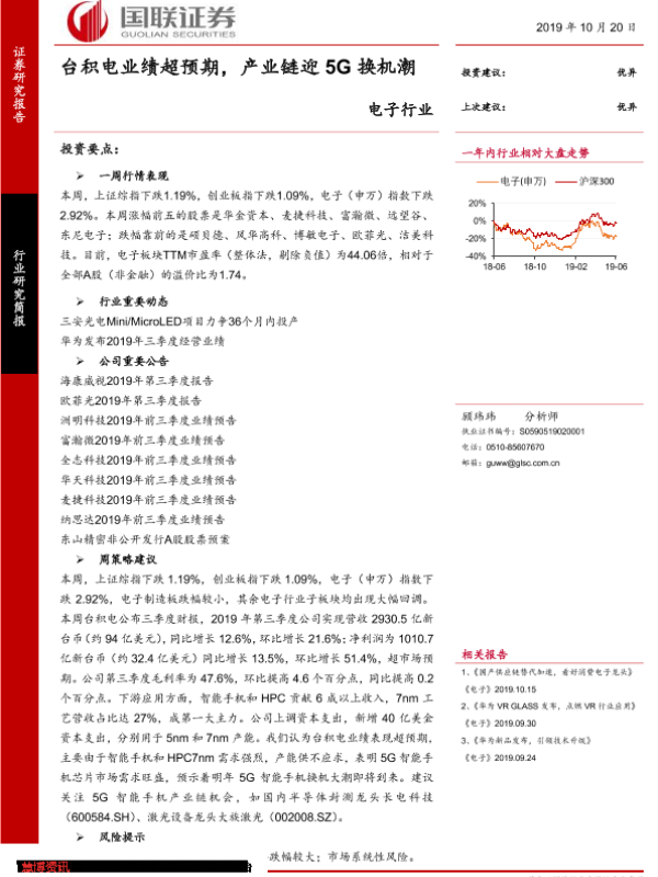 【国联证券】【20191020】电子行业:台积电业绩超预期,产业链迎5G换机潮-9页