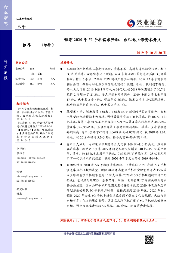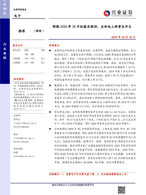 【兴业证券】【20191020】预期2020年5G手机需求强劲,台积电上修资本开支-11页