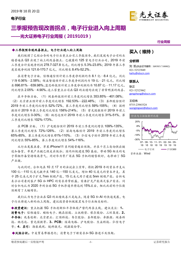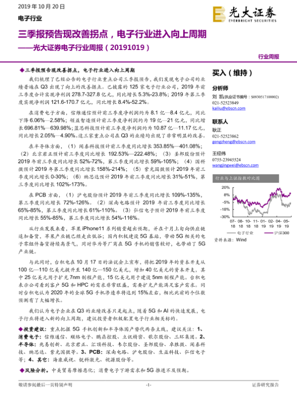 【光大证券】【20191020】电子行业周报:三季报预告现改善拐点,电子行业进入向上周期-19页