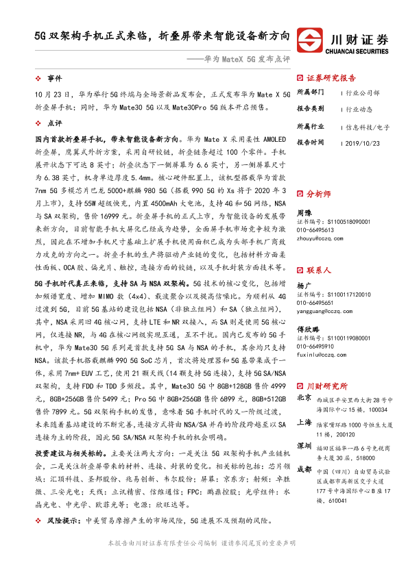 【川财证券】【20191023】电子行业动态:华为MateX 5G发布点评-5G双架构手机正式来临,折叠屏带来智能设备新方向-3页